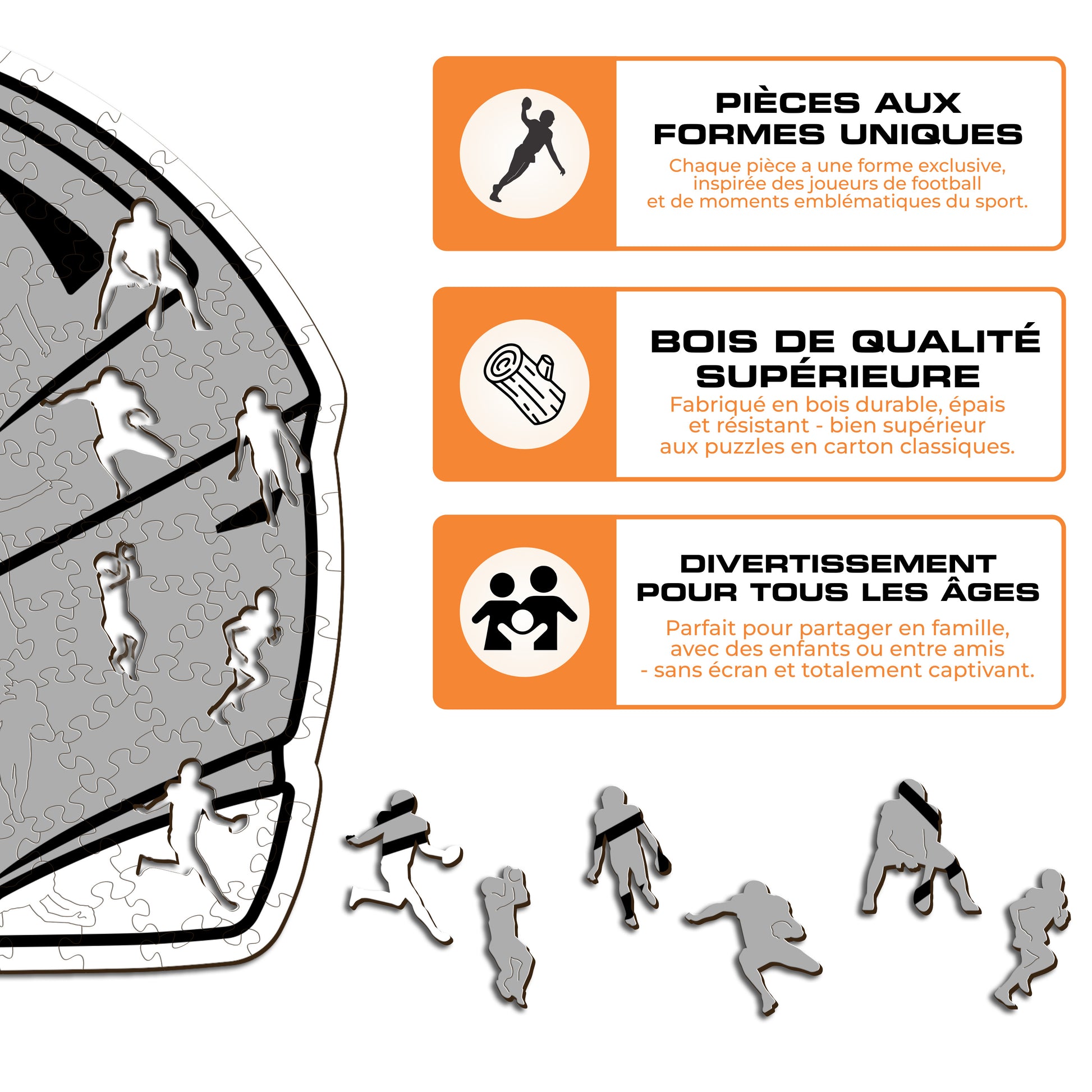 ✓ Chaque pièce du puzzle a une forme unique représentant des éléments liés au football et des poses emblématiques de joueurs.