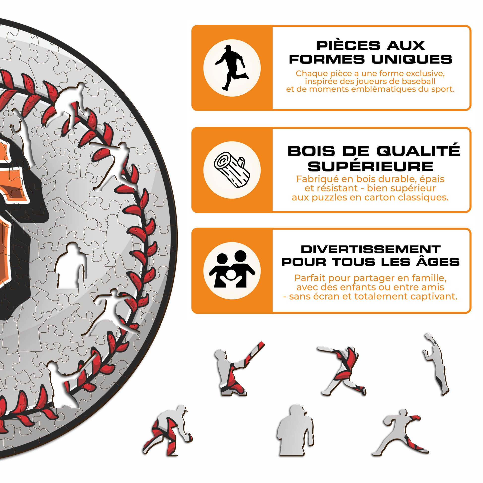 ✓ Chaque pièce du puzzle a une forme unique représentant des éléments liés au baseball et aux actes emblématiques des joueurs.