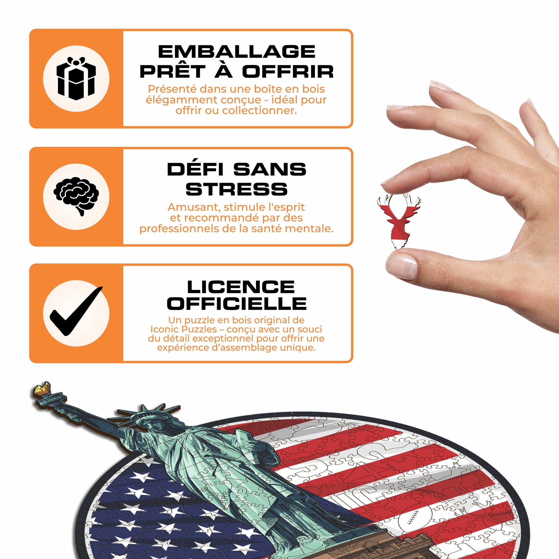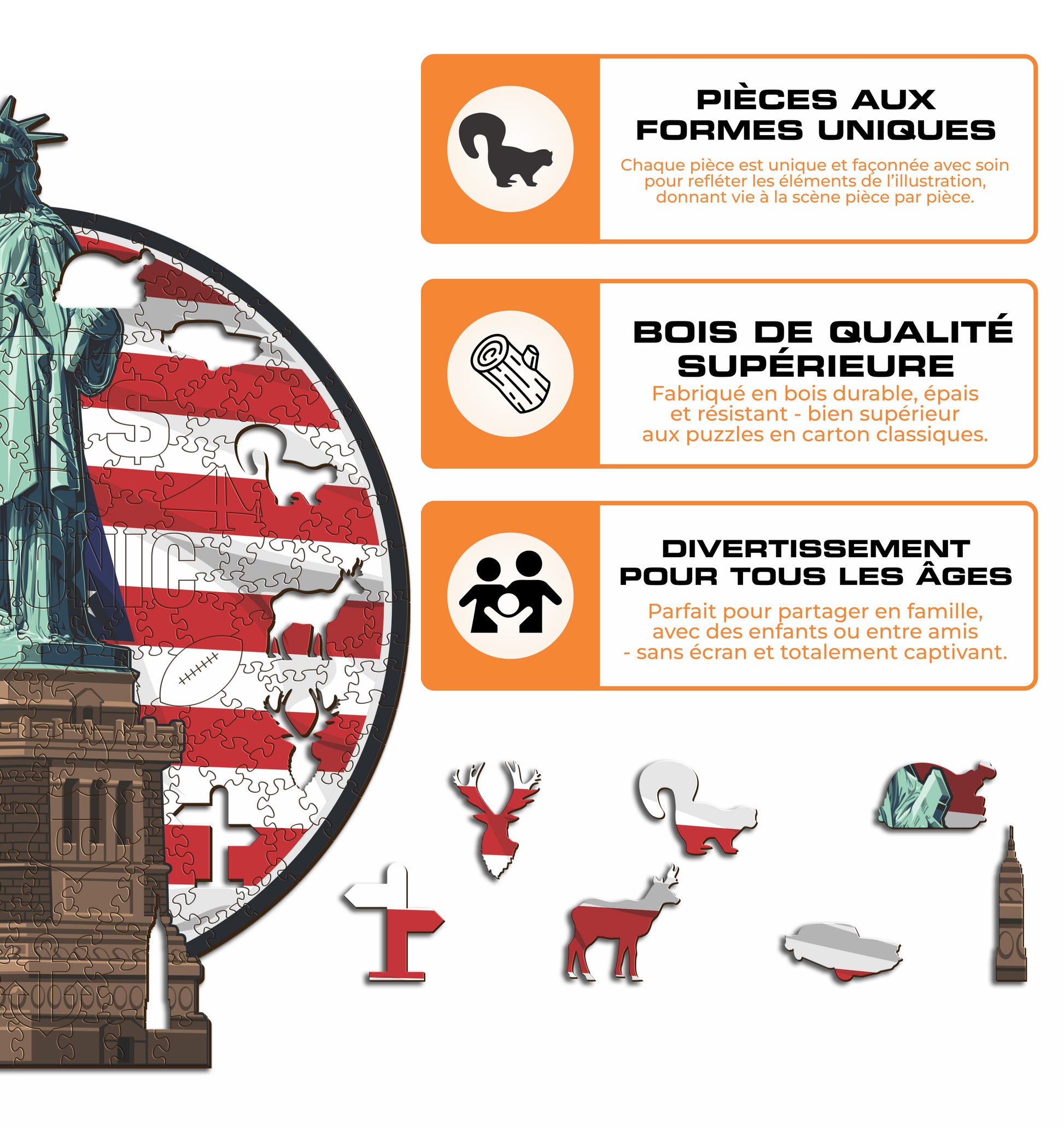 ✓ Chaque pièce du puzzle a une forme unique représentant des éléments liés les États-Unis.
